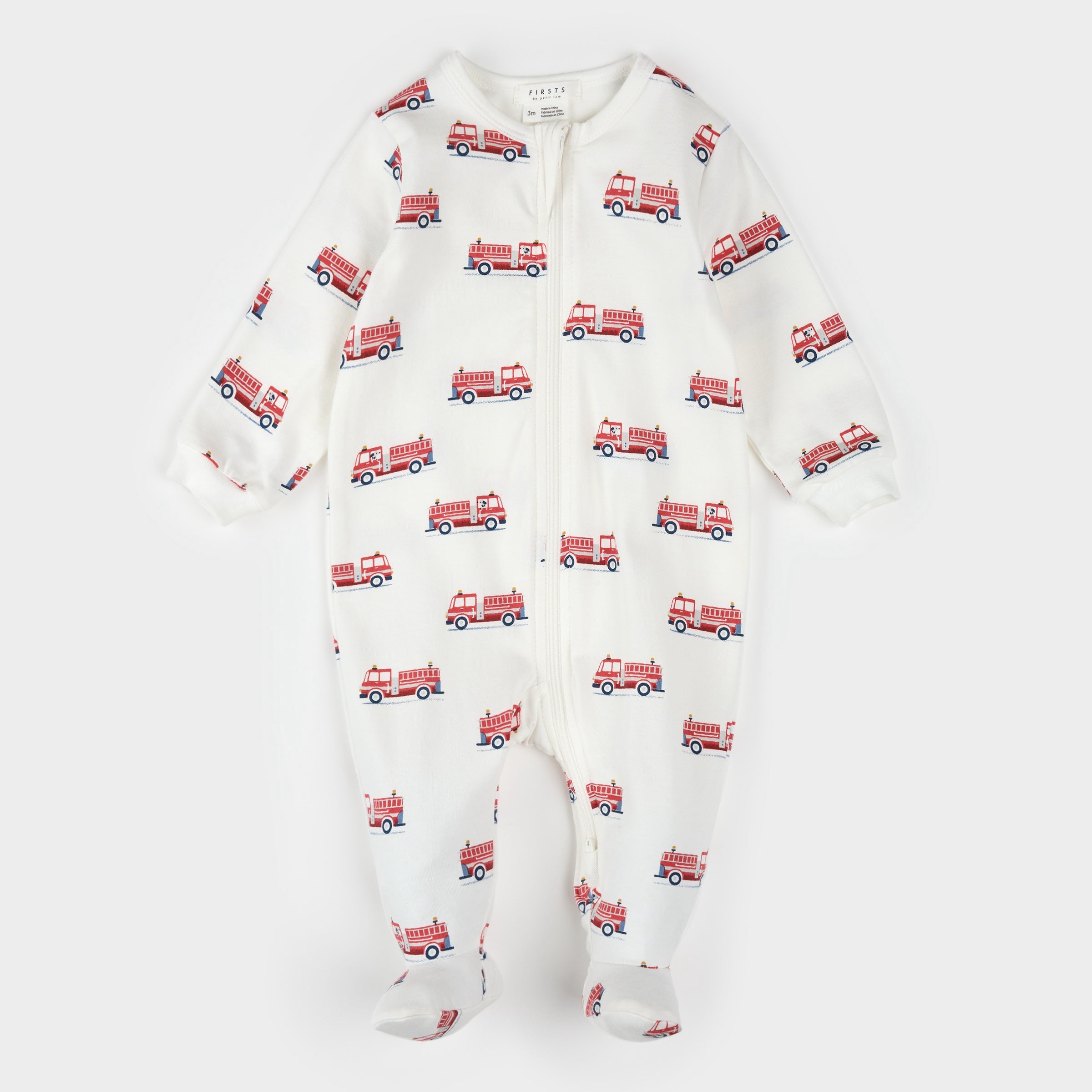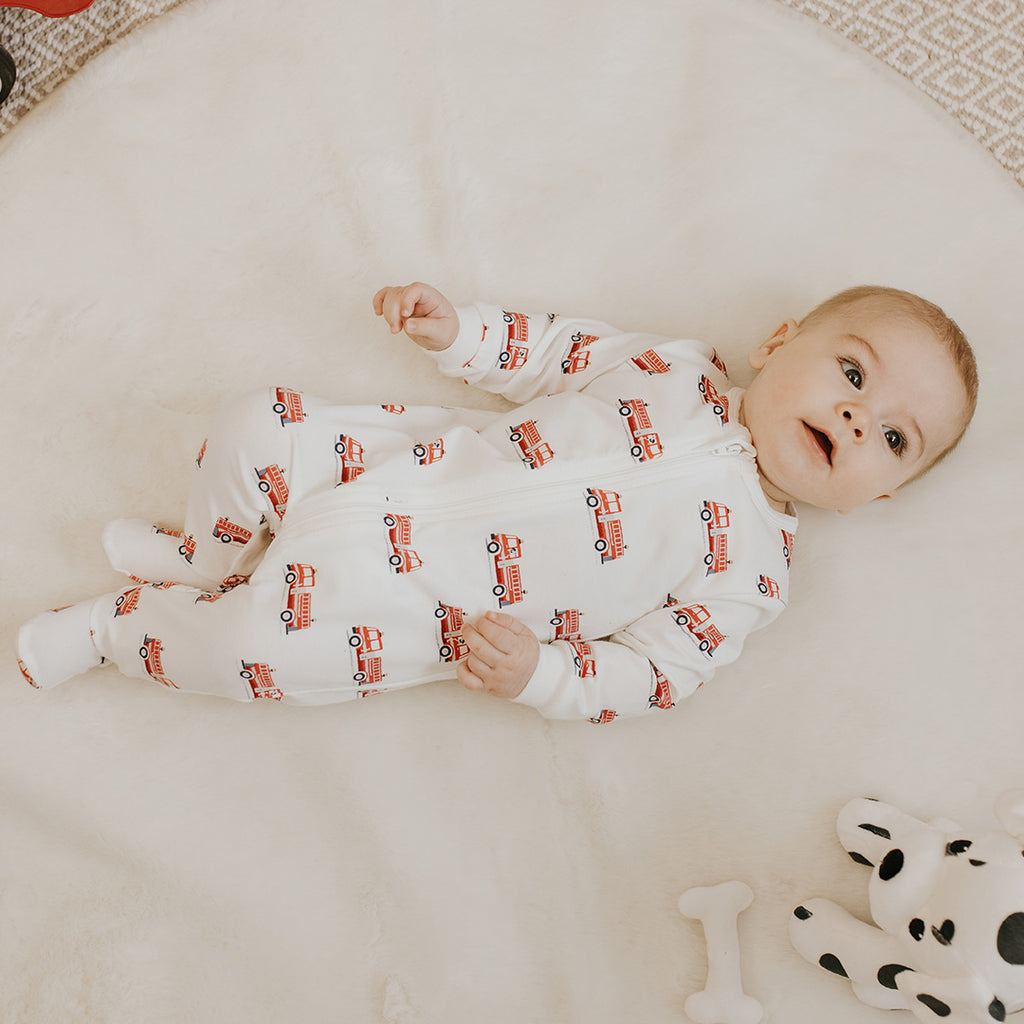 For tiny truck lovers, this Firetruck-printed sleeper is crafted from ultra-soft, organically grown cotton jersey for all-night comfort. Designed with ribbed cuffs and integrated feet, it keeps little toes snug while leaving curious hands to explore their surroundings. Fitted with our classic two-way zipper, the sleeper makes midnight diaper changing easier for the new parents.