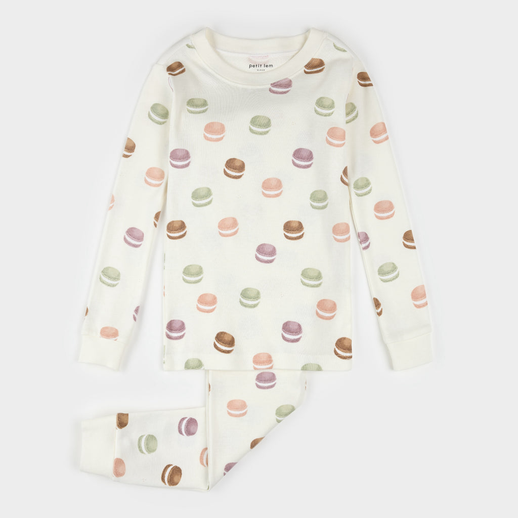 Soft and playful, this Macaron print PJ set makes bedtime extra sweet. The long-sleeved top and elasticated pants are made from a light, organically grown cotton rib for ultimate comfort and flexibility. Ribbed cuffs add a snug fit that leaves their hands and feet free for running and playing. There’s matching sleepers available for little siblings, too!