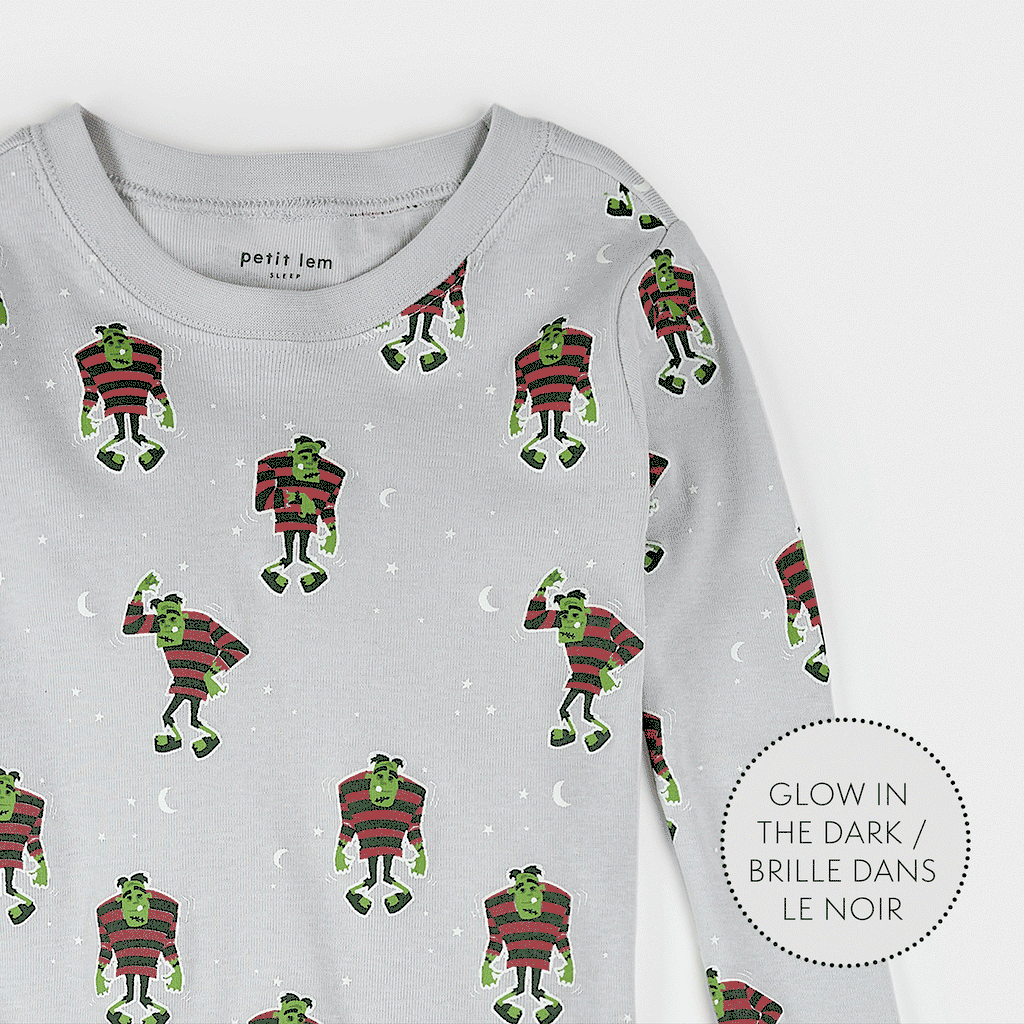 Let them embrace their inner monster with this glow-in-the-dark Frankenstein-print PJ set! The playful set is made from organically grown cotton rib for a comfy fit from day till night and it’s finished with ribbed cuffs and ankles. Perfect for spooky sleepovers and happy haunting, there’s a matching footed sleeper available for little monsters.