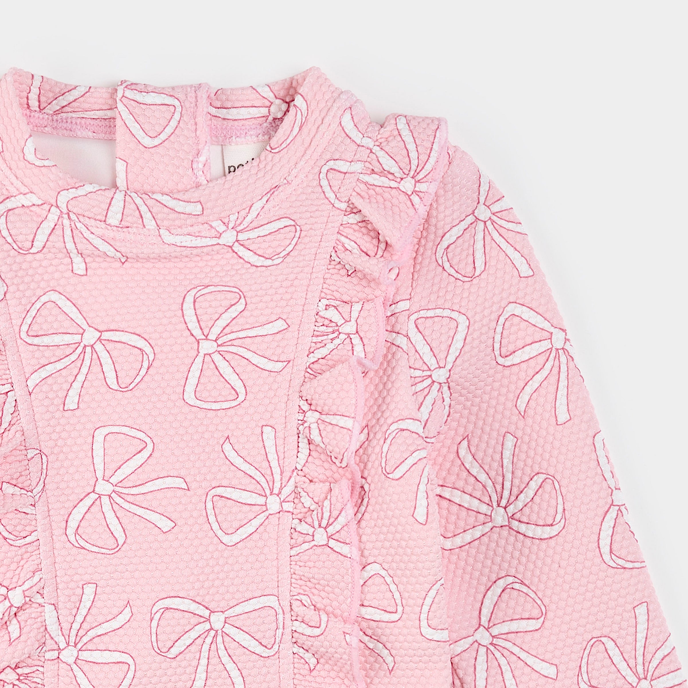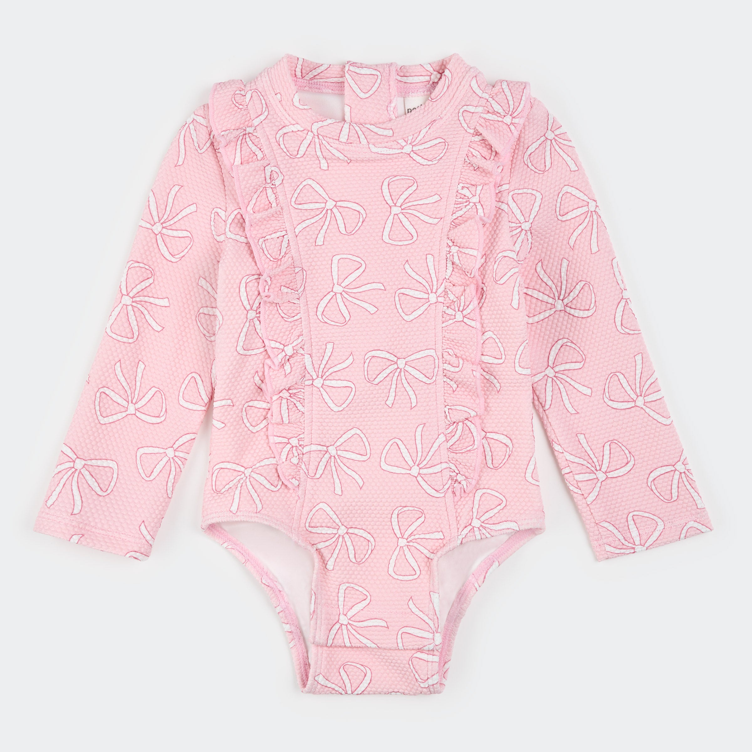 Ready for sun-soaked adventures, this long-sleeved Bows print bodysuit keeps her comfortable, covered and cute. The waffle-textured one piece is soft and stretchy for easy wear while the ruffle trim down both sides add a playfulness she’ll love. Perfect for days without a cloud in the sky, the swimsuit has built-in UPF50+ sun protection.