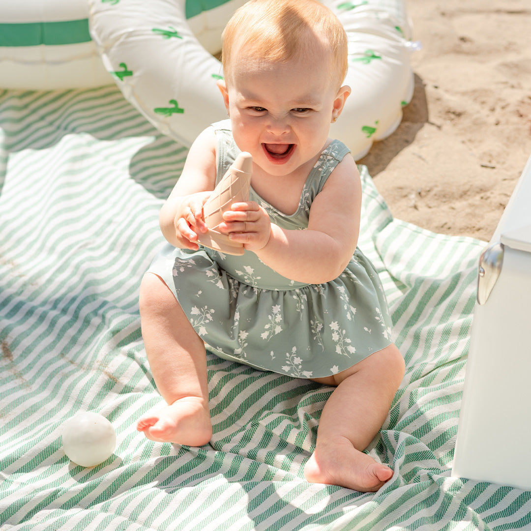 Perfect for little beach explorers, this peplum swim bodysuit offers fun, comfort and protection for the best day in the sun. The playful piece is made with a weft knitted fabric that’s stretchy for simple dressing and quick drying for all-day comfort whether playing in the sand or splashing through the waves.