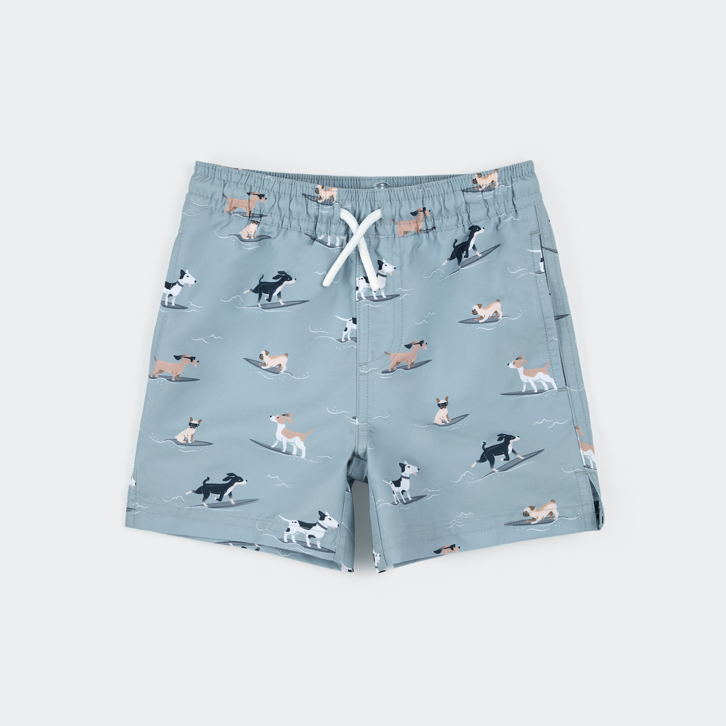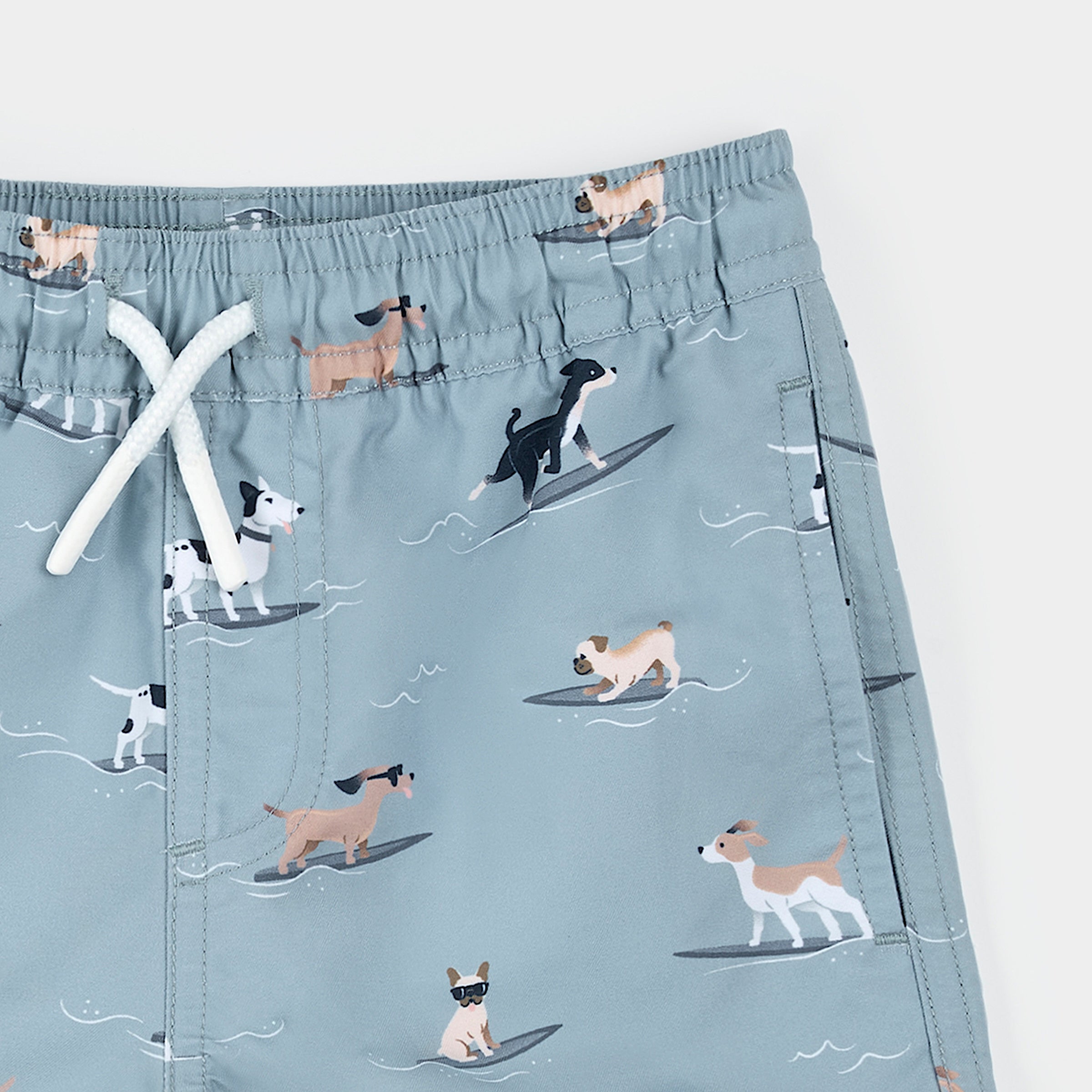 Surfing Pups Print on Blue Swim Trunks