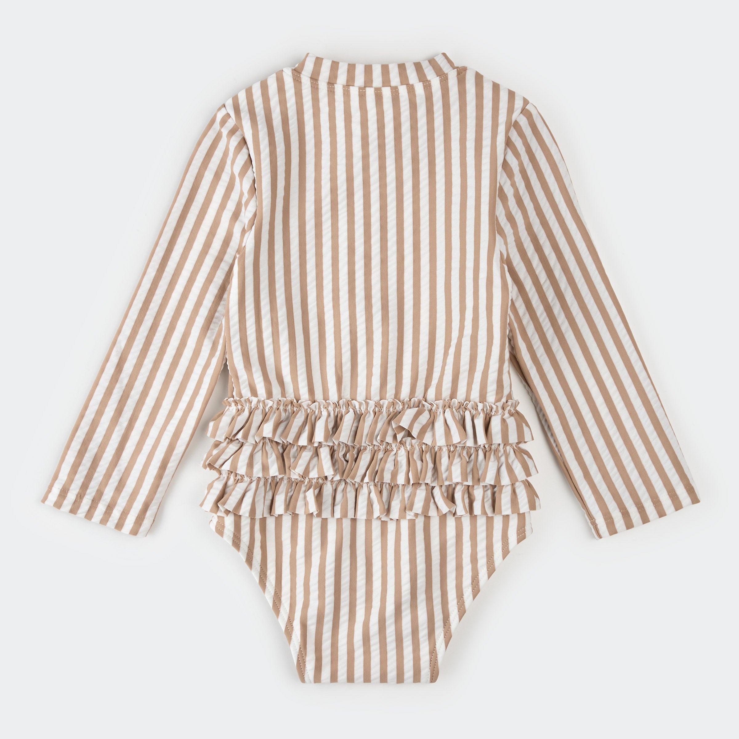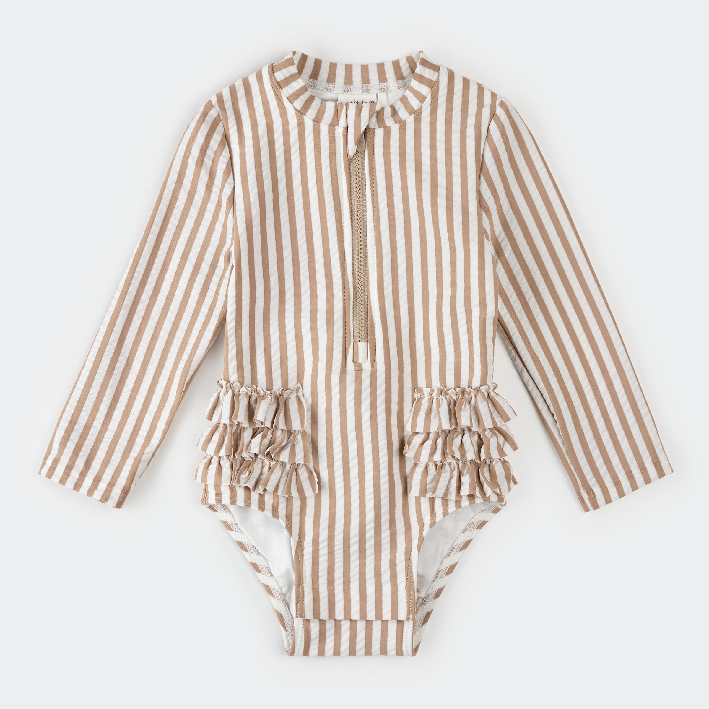 Made for family days by the sea, this taupe stripe, seersucker bodysuit coordinates effortlessly with swimwear available for the whole family. Keeping her comfortable through every giggle and splash, the swimsuit provides full coverage with its long-sleeved design and built-in UPF50+. The front zipper makes dressing quick and fuss-free, so spontaneous dips and sandy adventures are always an option.