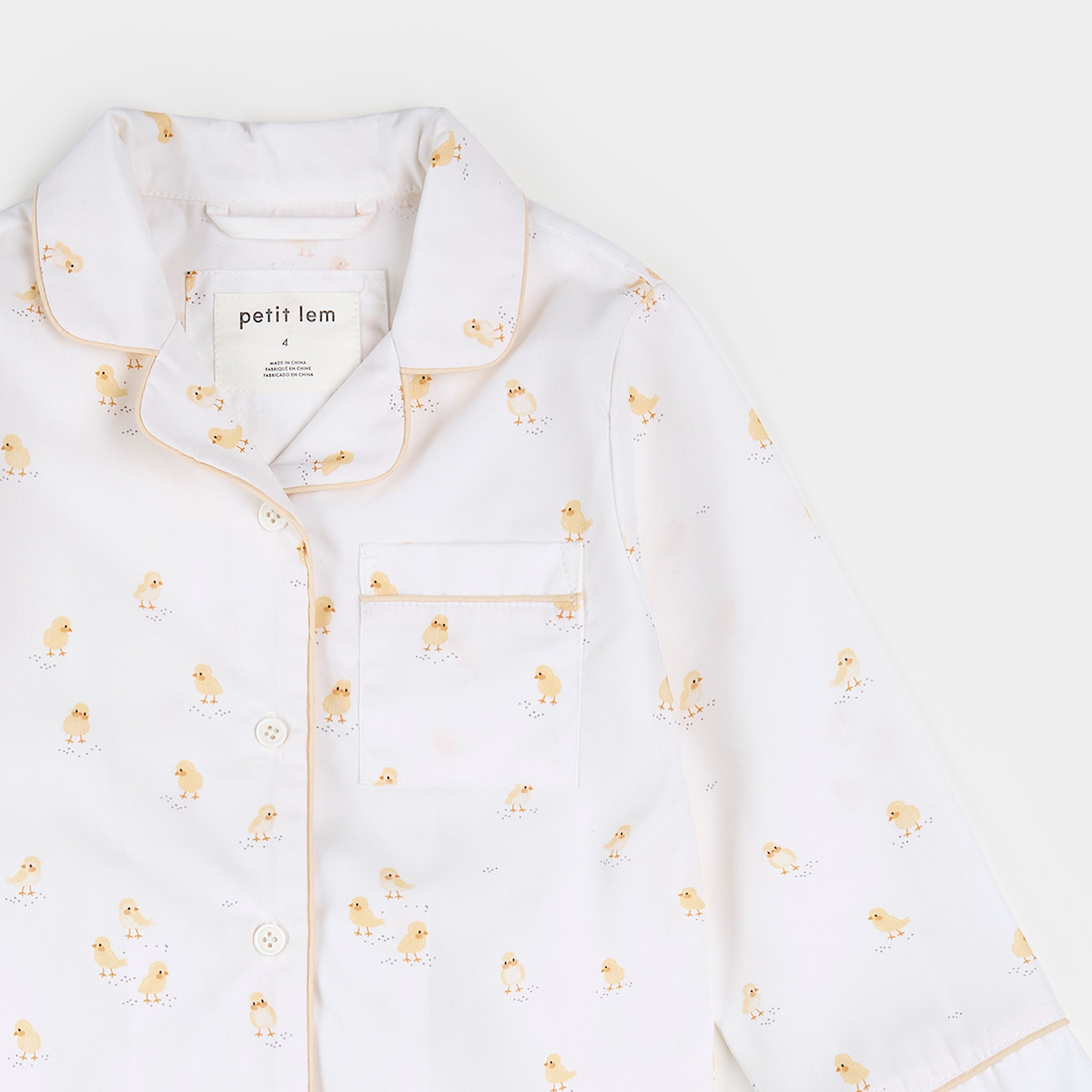 This poplin PJ set has a classic style with its notch collar and straight-cut pants. Perfect for twinning with mom and younger siblings for the Easter season, the set features our all-over Chicks print that you’ll all love. With buttons on the top and a simple elasticated waistband on the pants, they’re easy to throw on before a festive photoshoot or for all day wear. Perfect for family movie nights, egg hunts and making memories.